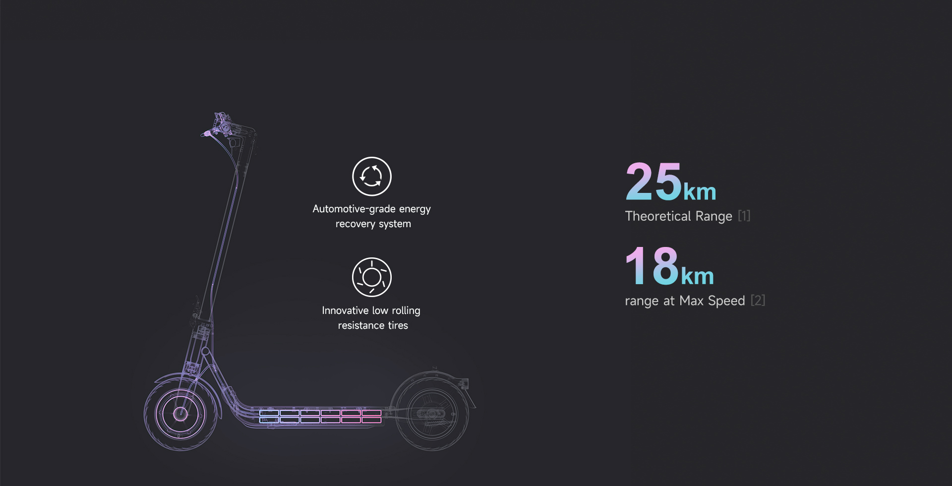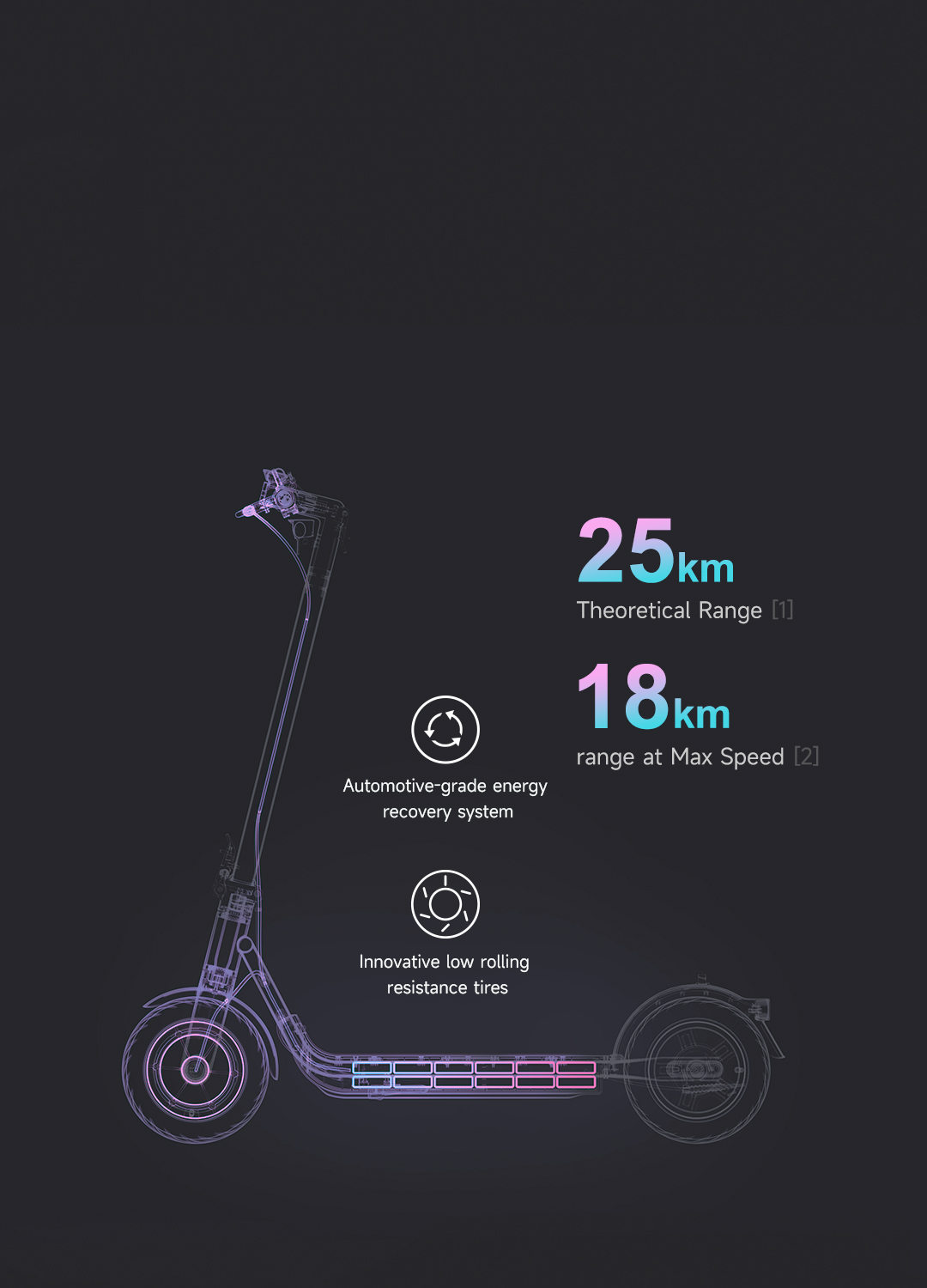 *Макс. обхват 25 км: Тестове при пътуване с напълно заредена батерия, товар 75 кг (165 lbs.), 25°C (77°F), със средна скорост 15 км/ч по асфалт.
