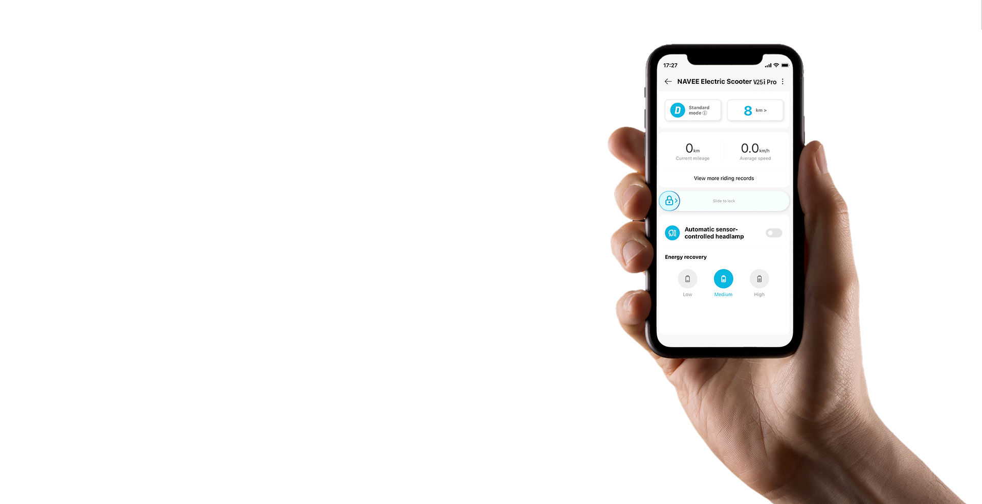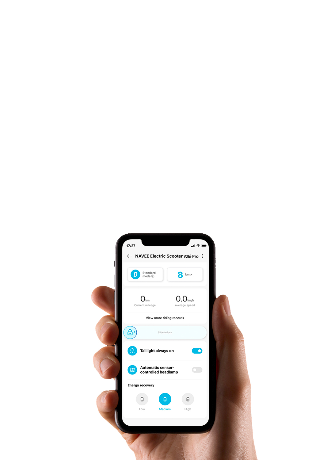 A: Докато карате скутера, когато натиснете спирачния лост или освободите газта за плъзгане, ще се задейства възстановяване на енергия, като част от кинетичната енергия ще се преобразува в електрическа енергия за съхранение и повторно използване. Възстановяването на енергия увеличава издръжливостта и в същото време осигурява спирачен ефект. Когато го използвате за първи път, се препоръчва да зададете нивото на „Слабо“. След свързване с NAVEE APP, превъртете надолу до долната част на основния интерфейс на продукта, за да зададете интензивността на възстановяването на енергия, като стандартната настройка е зададена на слаба, но можете да изберете три нива, напр. слаба, средна и силна.